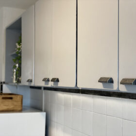 Fueron días de muchas risas, trabajo y sinergia en equipo. Pintamos los muebles, los cerámicos, las paredes, cambiamos los artefactos de luz, los mobiliarios, volamos la pared divisoria, colocamos piso, agregamos distintos items de deco y demás elementos que generaron un gran cambio.