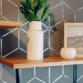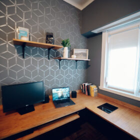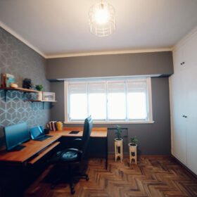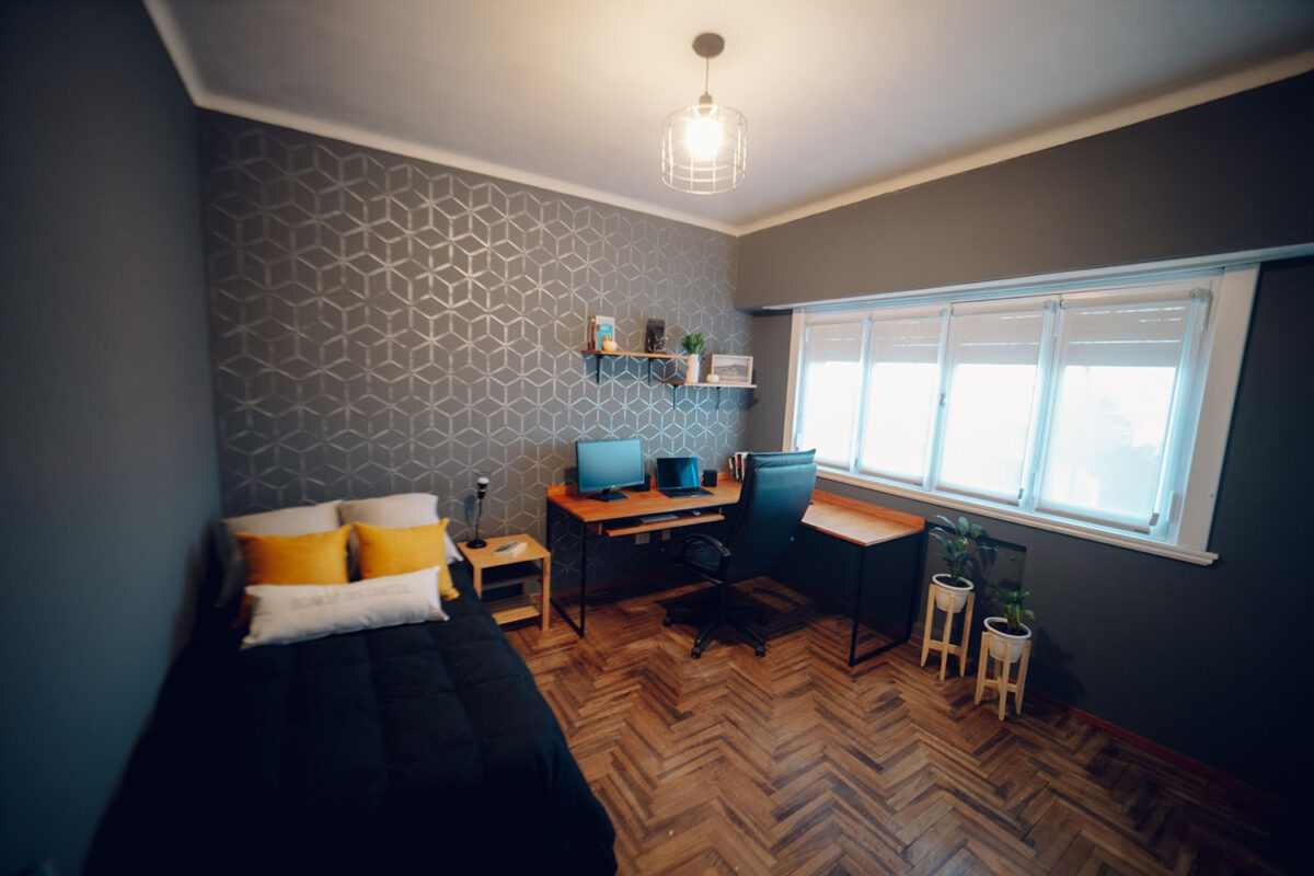 Con la ayuda de Caty, le dimos personalidad a esta habitación, se pintaron las paredes y pusimos el estencil tecno de @decox2lab, cambiamos el aplique de luz principal, pintamos carpinterías y mandamos a hacer un escritorio y repisas para que pueda trabajar cómodamente, cambio de cortinas, sumar objetos deco y plantas para dar vida son alguno de los otros detalles.