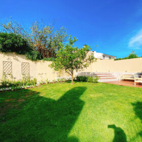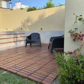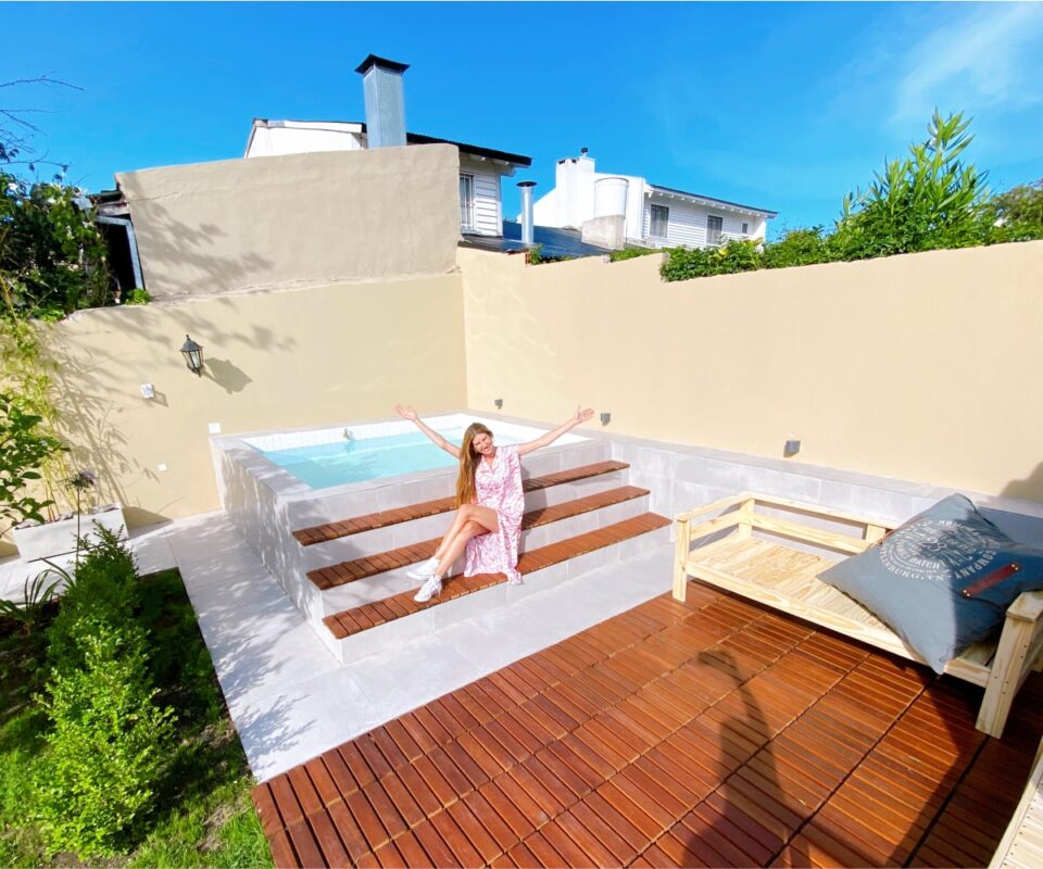 Este tipo de piscinas es un recurso más económico, más rápido y con menos mantenimiento que las piscinas tradicionales. Para que no desentonara con lo linda que quedó, también arreglamos el patio con nuevos canteros y juego de jardin.